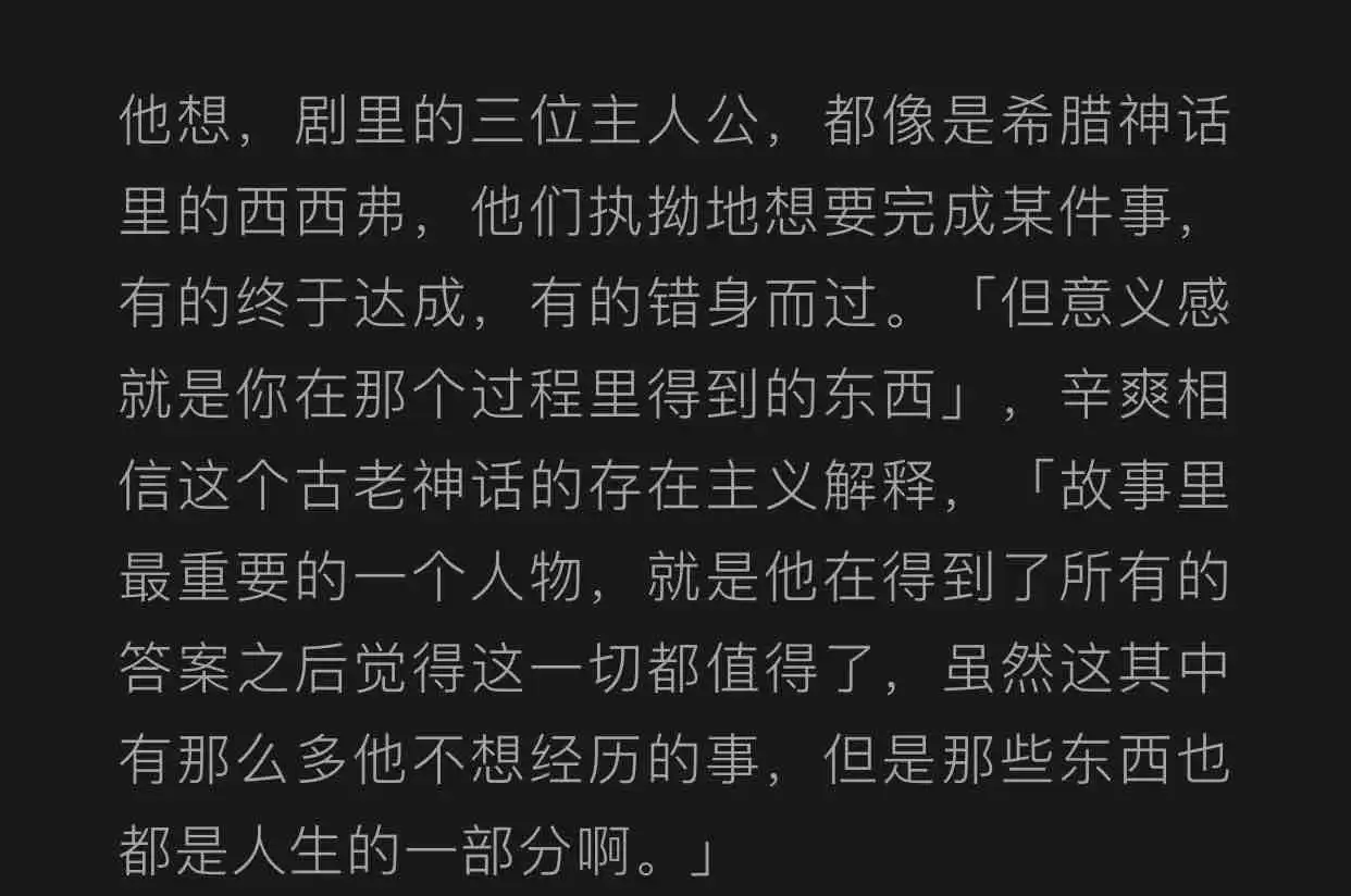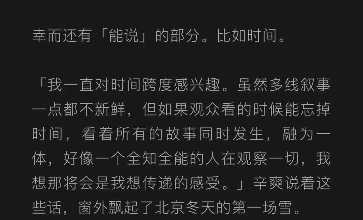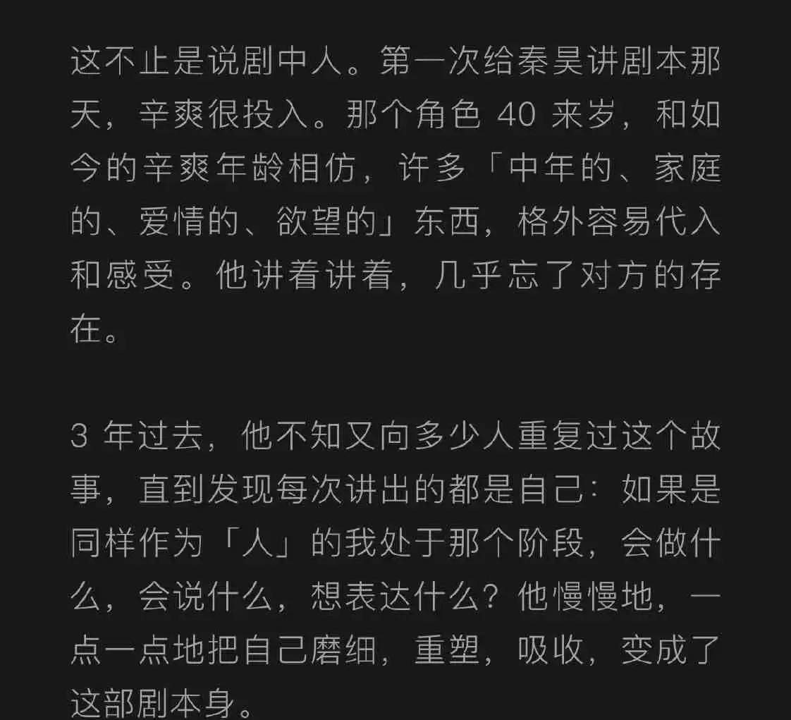 辛爽导演从来不做“注意看我要说立意了”的事,但和他共鸣到是那么自然的。在某场人物对话的空隙里,也许就是一瞬留白,你突然鼻头一酸,叹一口气。这是细品之后的巨大香气,几乎所有角色身上,都有这样斑斓的滋味。