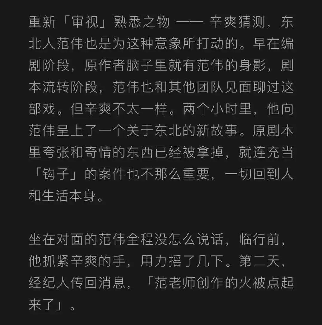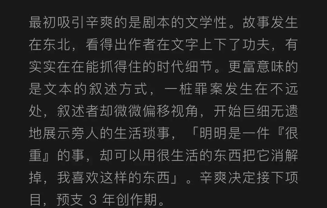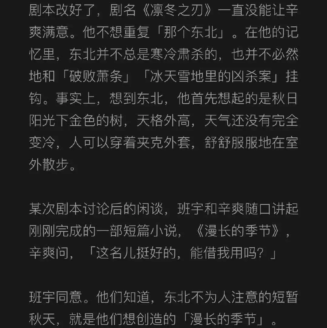一个细节,剧名原本是《凛冬之刃》,但这个名字一直没能让辛爽满意,他不想重复“那个东北”和「破败萧条」、「冰天雪地里的凶杀案」挂钩。