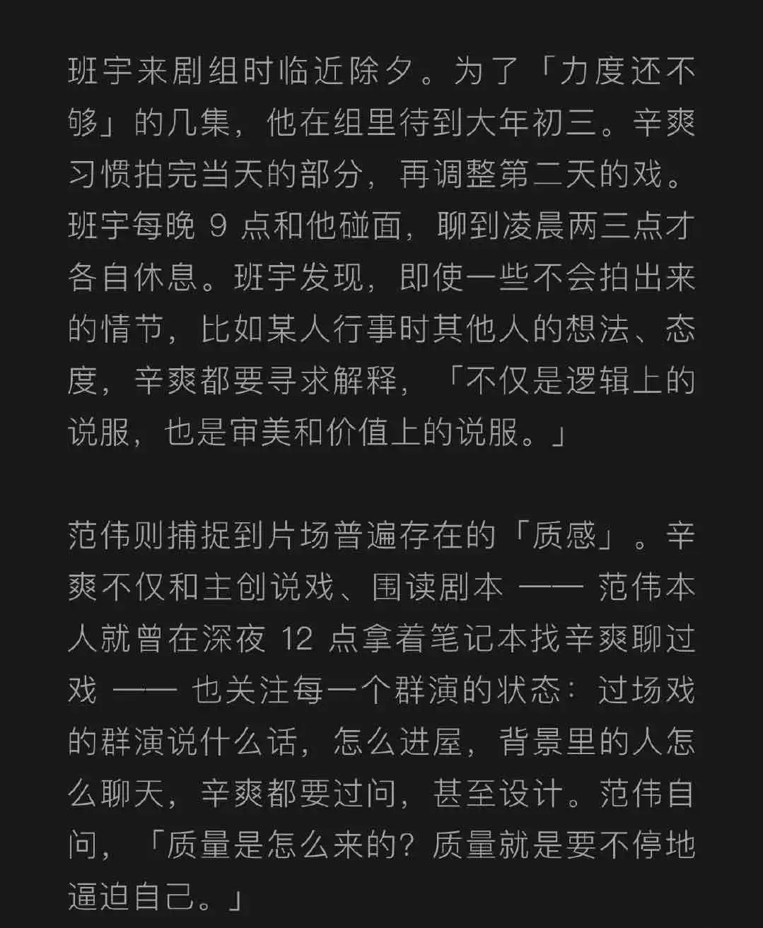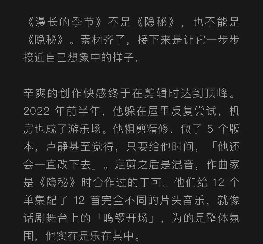 辛爽导演的访谈曝光了最新信息:12 集体量的剧集,拍摄了 107 天,剪了 5 个版本,半年的时间制作后期。